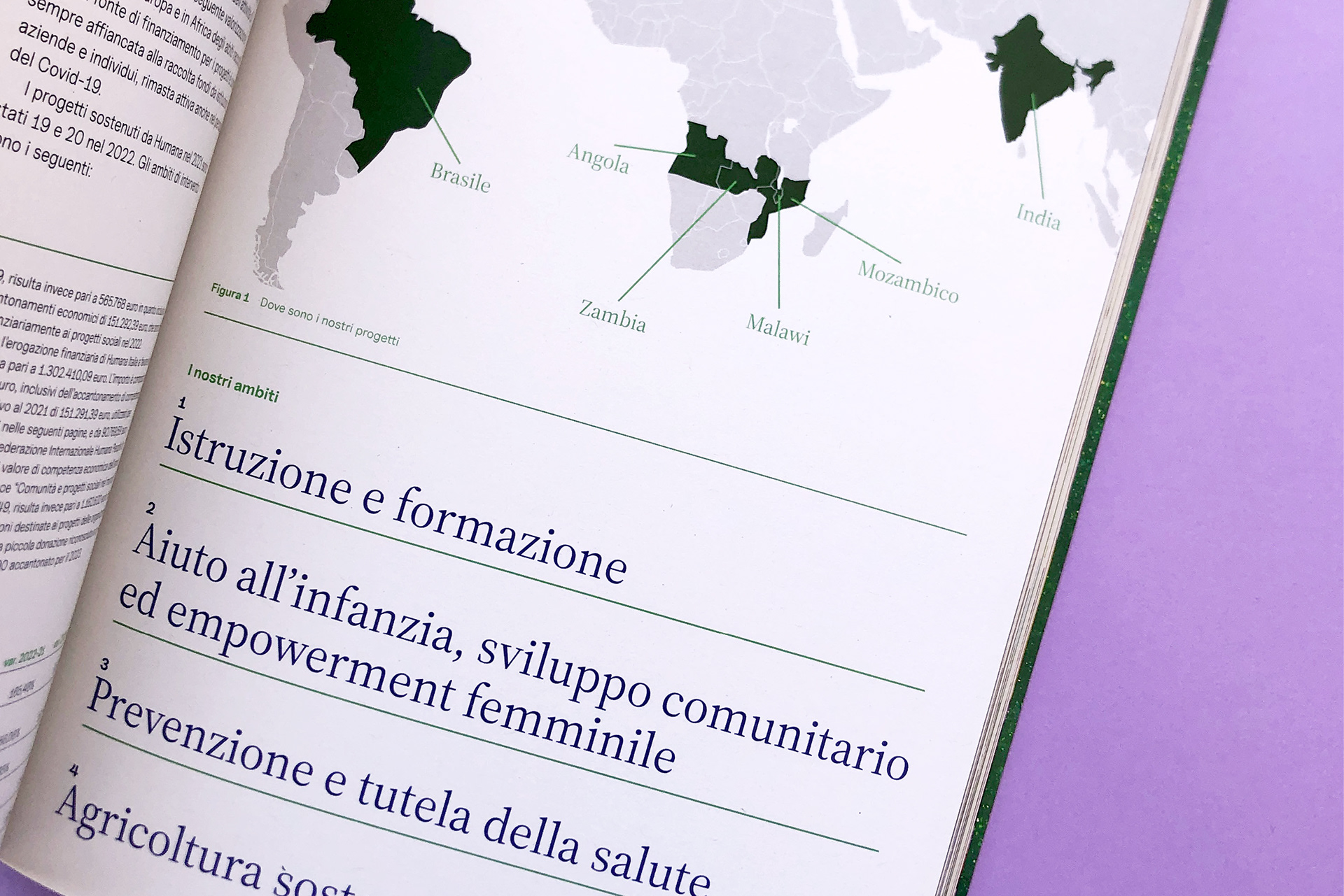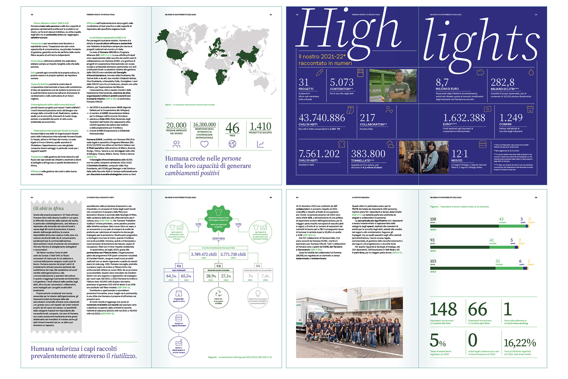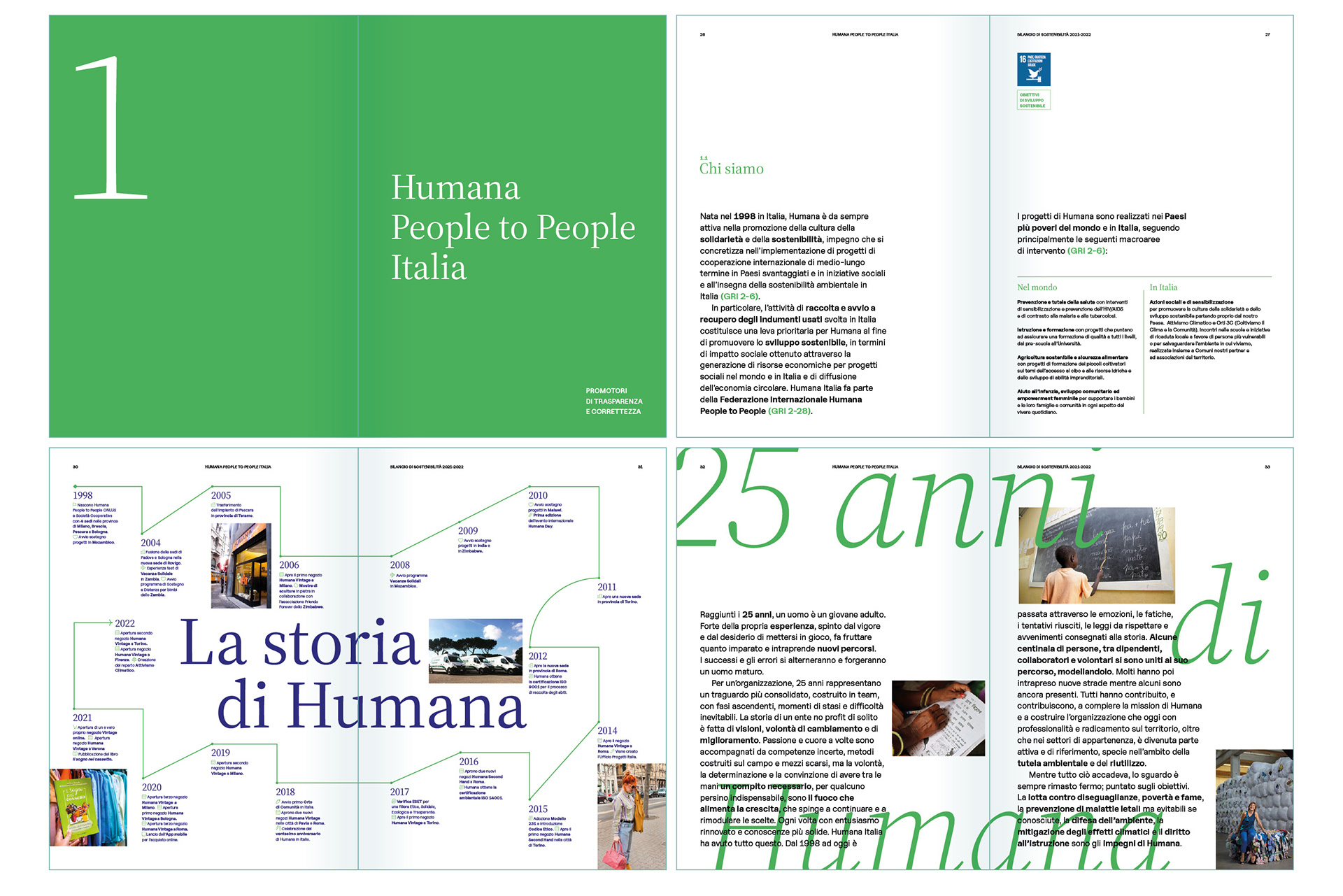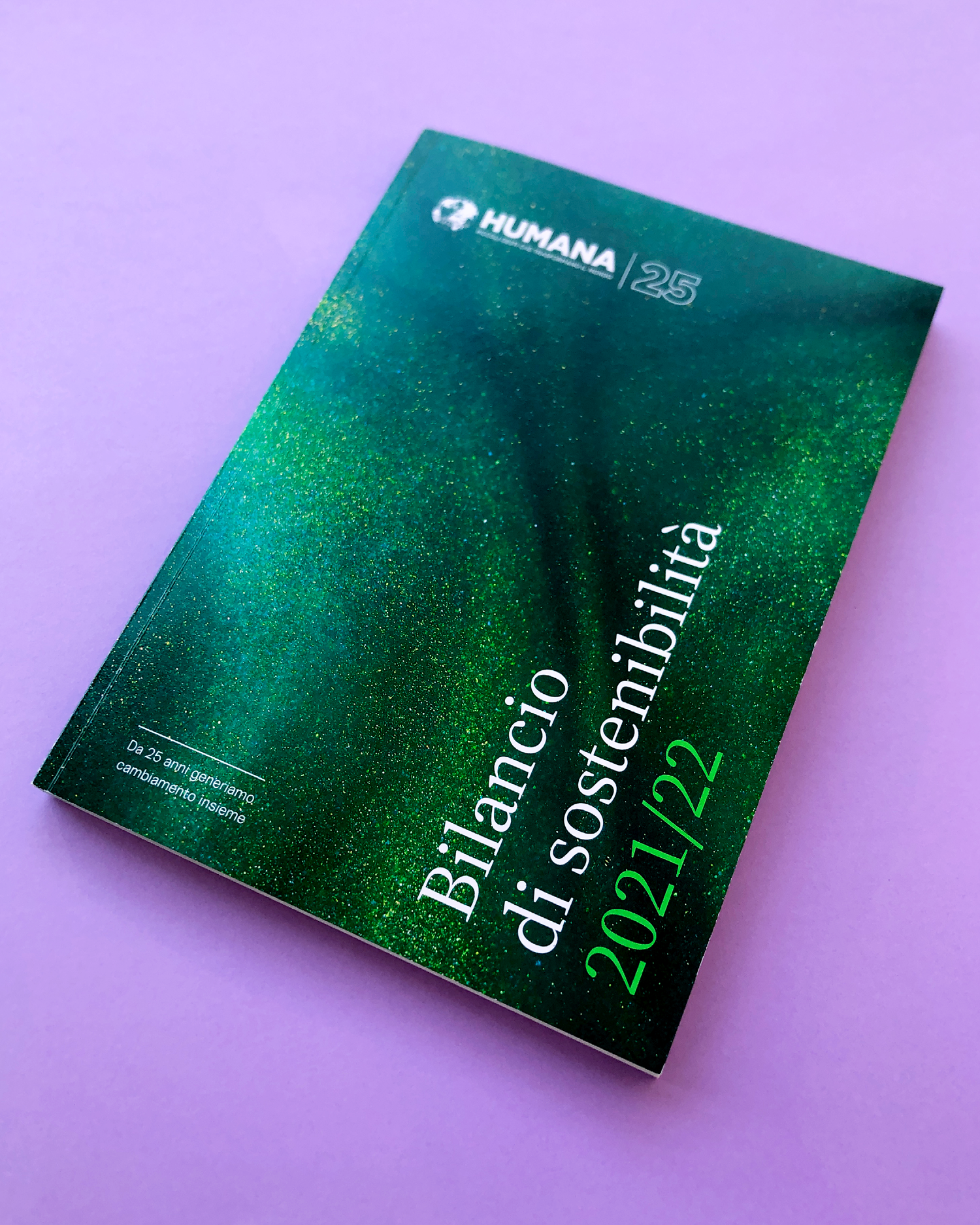 Quasi sempre inizio un nuovo progetto dalla definizione della palette di colori. Anche nel caso dell’Annual Report di Humana People to People, prima ancora di definire struttura e layout, ho lavorato con il colore. A partire dalle linee guida del brand di Humana, ho sviluppato una palette coerente, attorno alla quale ho poi costruito il progetto editoriale.