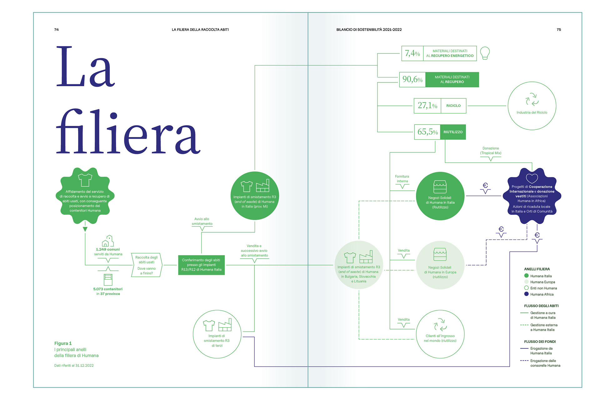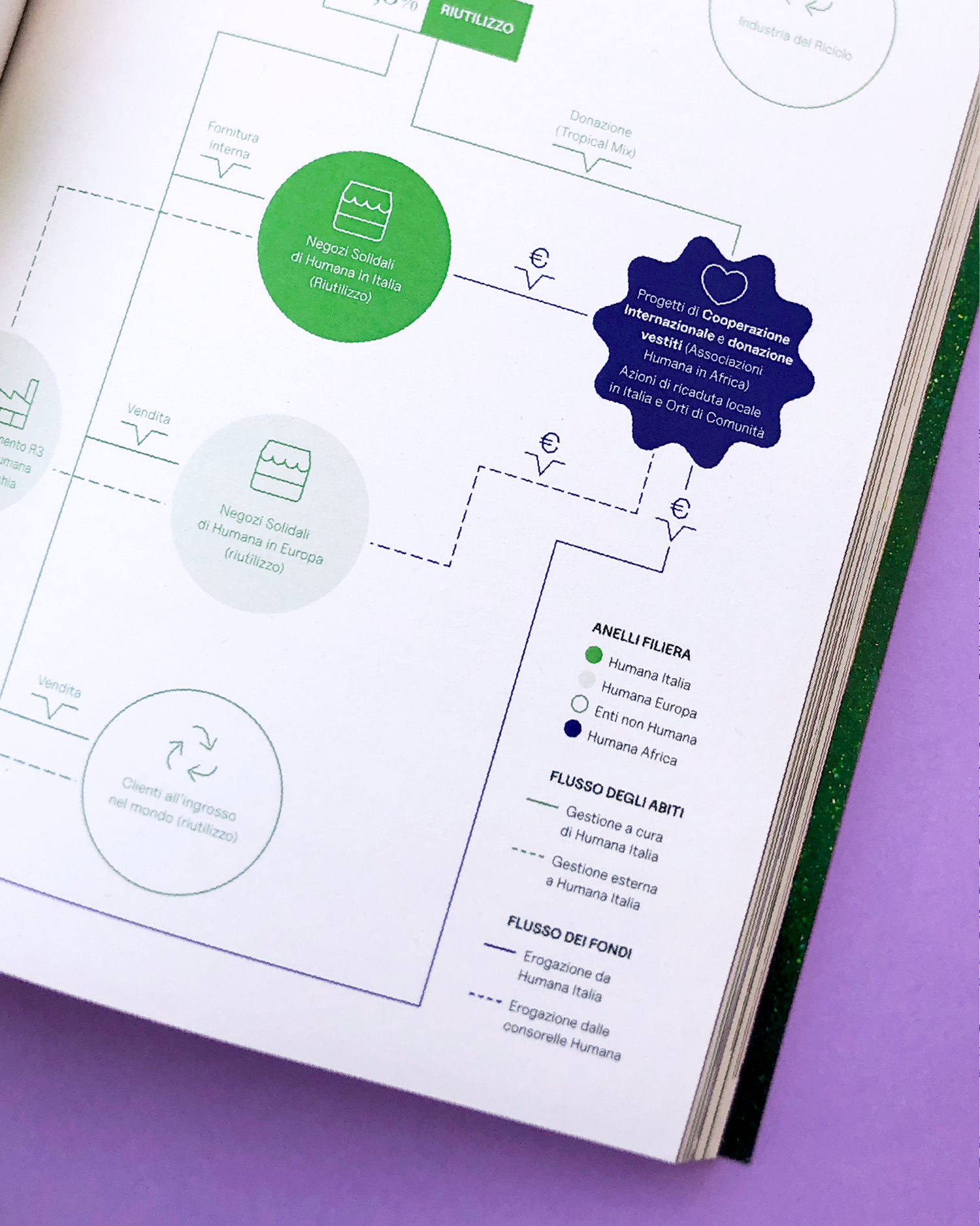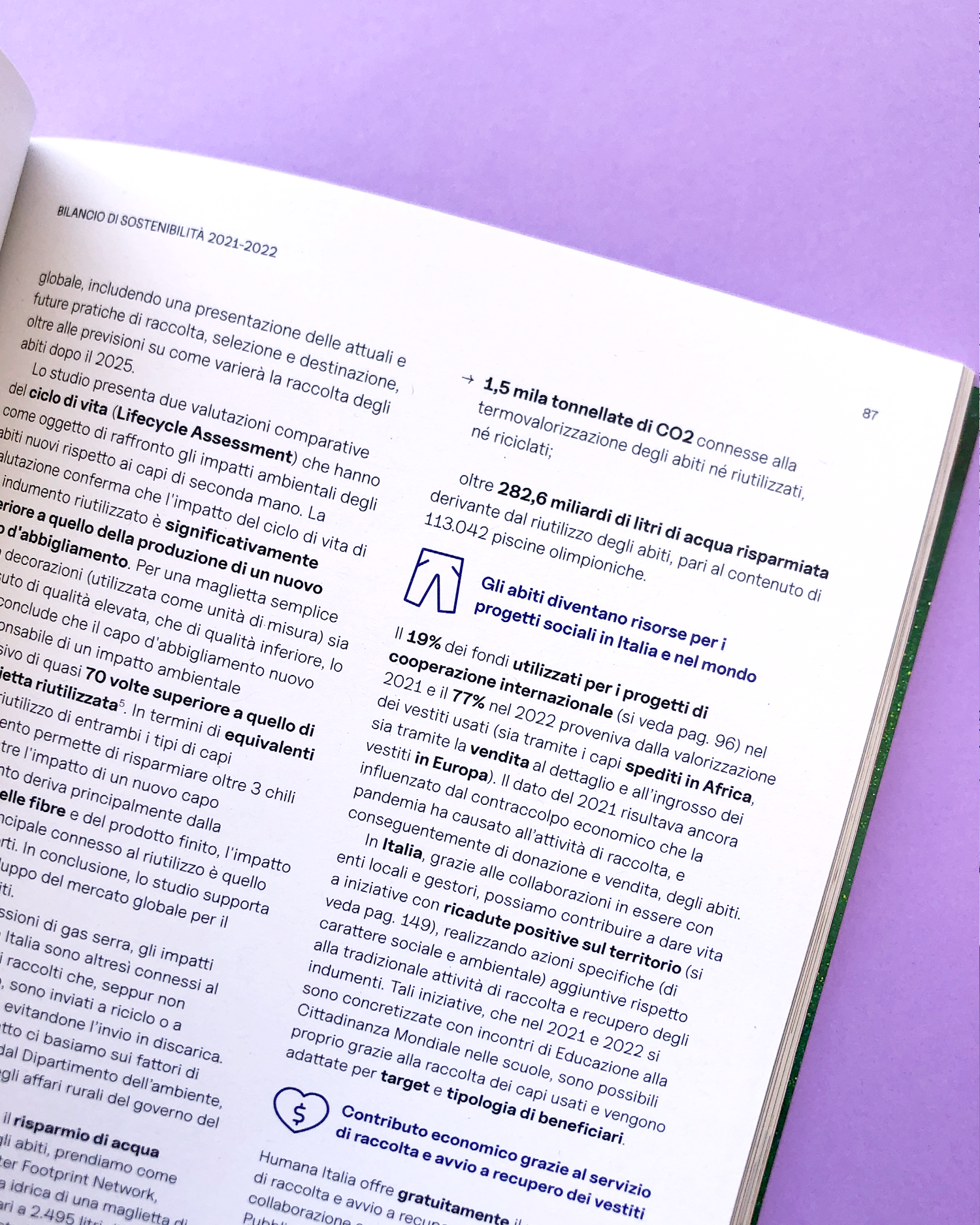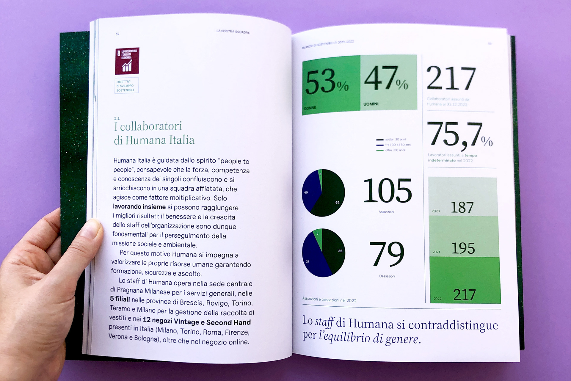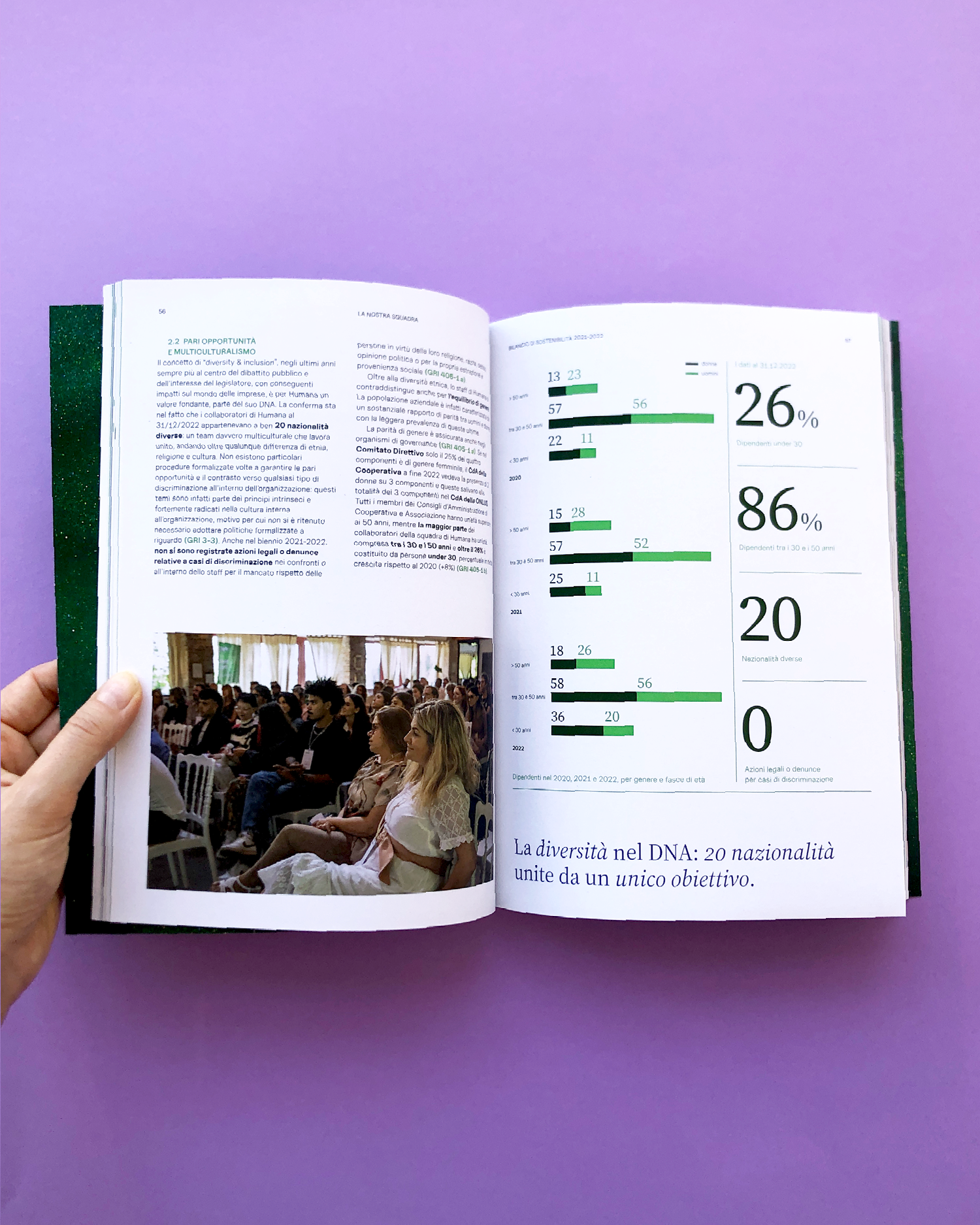Quasi sempre inizio un nuovo progetto dalla definizione della palette di colori. Anche nel caso dell’Annual Report di Humana People to People, prima ancora di definire struttura e layout, ho lavorato con il colore. A partire dalle linee guida del brand di Humana, ho sviluppato una palette coerente, attorno alla quale ho poi costruito il progetto editoriale.