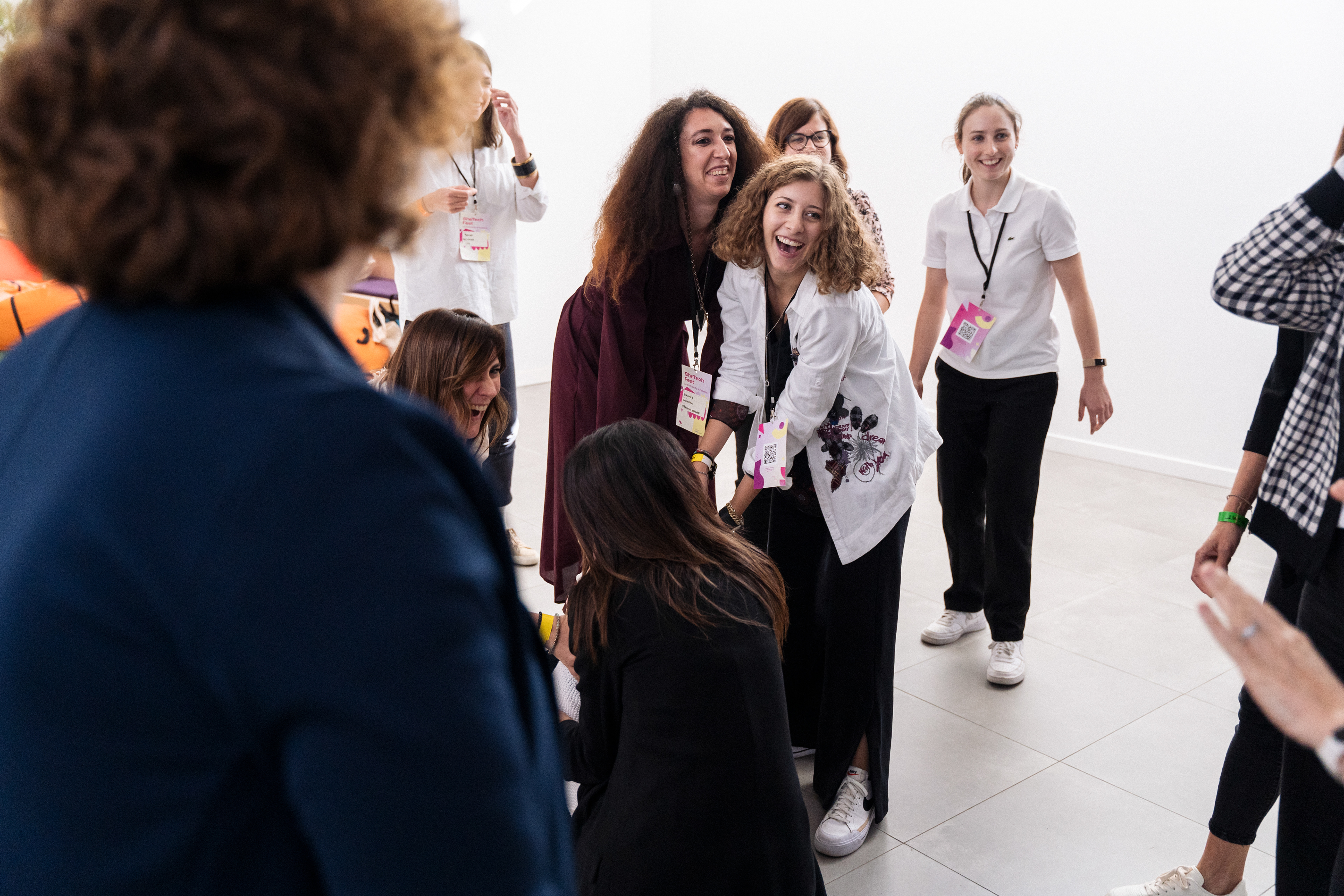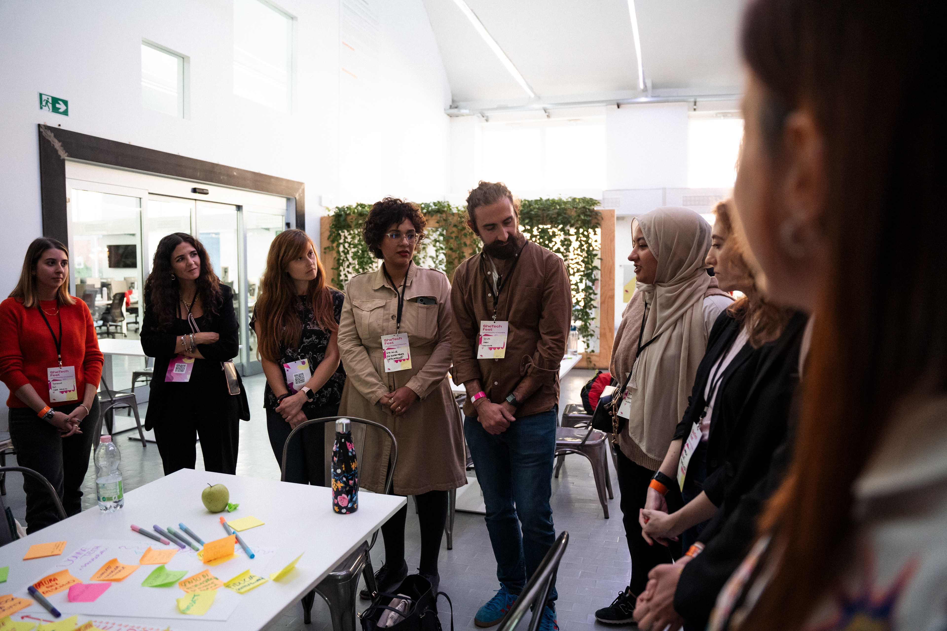 Lo step finale è stato quello di progettare tutti i materiali coordinati, sia cartacei che digitali, tra cui le diverse tipologie di badge, la segnaletica e i totem per l’evento, i template per le presentazioni dei talk e gli artwork per i social media.
