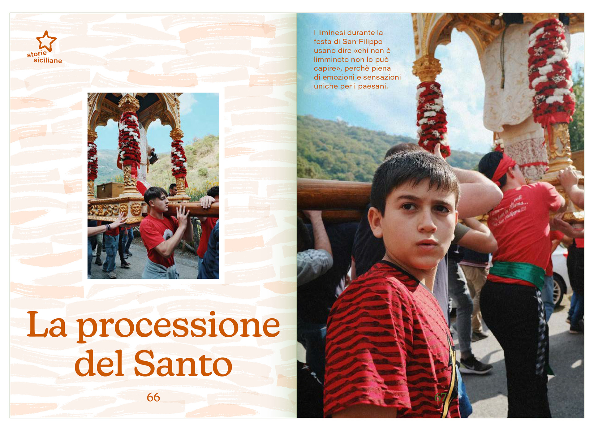 Il territorio della Valle d’Agrò è caratterizzato da dolci paesaggi collinari, un clima mite e piccole comunità locali molto ospitali, indissolubilmente legate ad antiche tradizioni e riti religiosi collettivi. La narrazione di queste storie passa anche attraverso l’utilizzo di uno schema cromatico ben preciso.