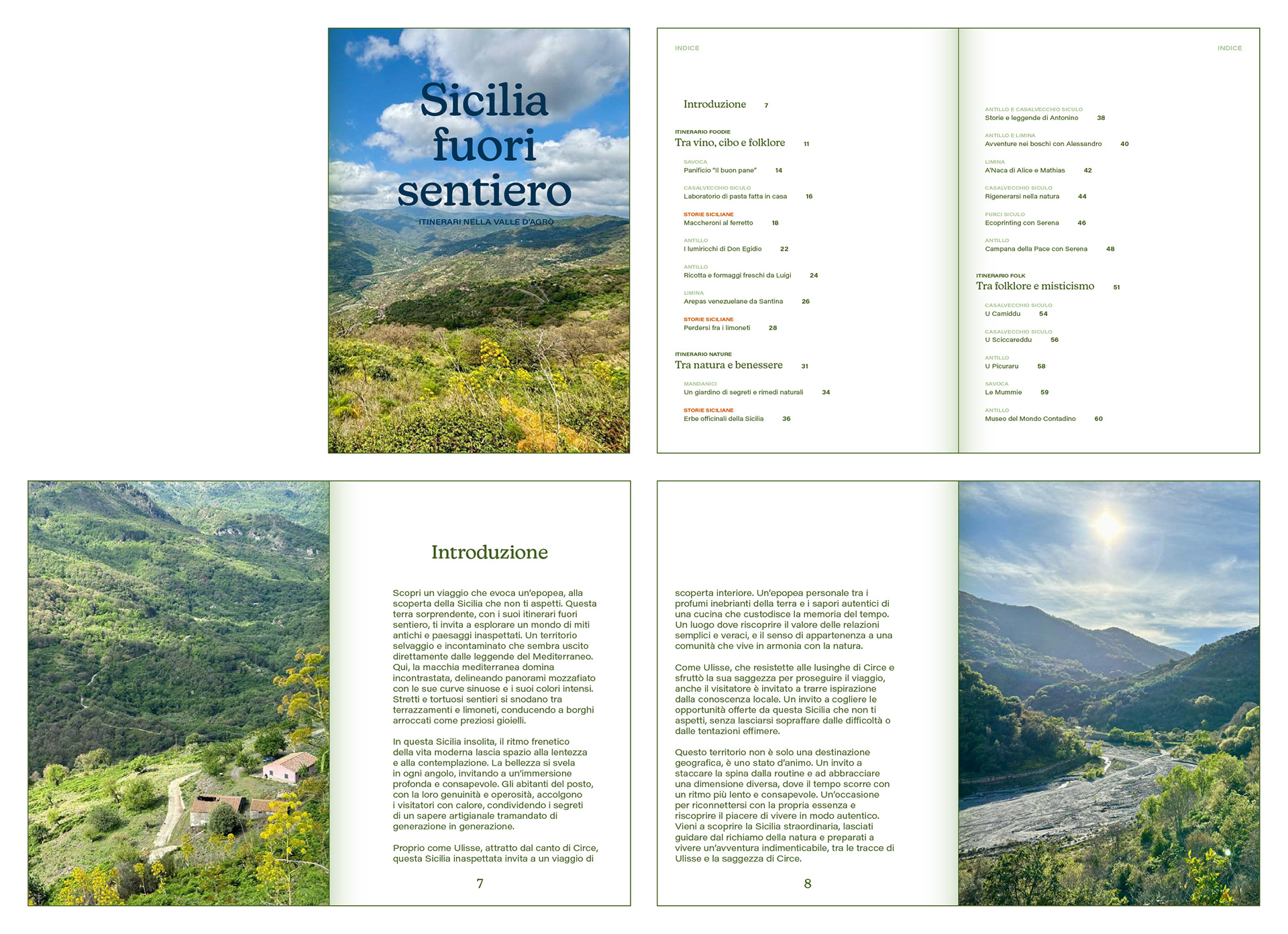 Sicilia fuori sentiero è il racconto di un viaggio documentato da fotografie “on the road”. La progettazione grafica dell'ebook ha tenuto conto di questa testimonianza, dando spazio a sperimentazioni visive, in cui le foto dialogano con tipografia, pattern e illustrazioni, senza perdere la loro valenza o espressività.